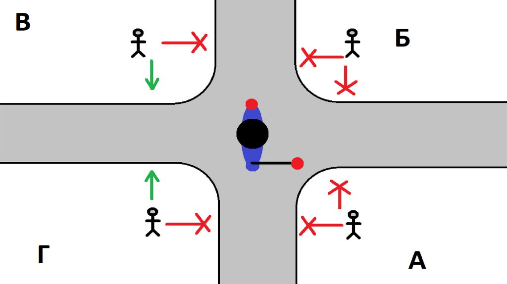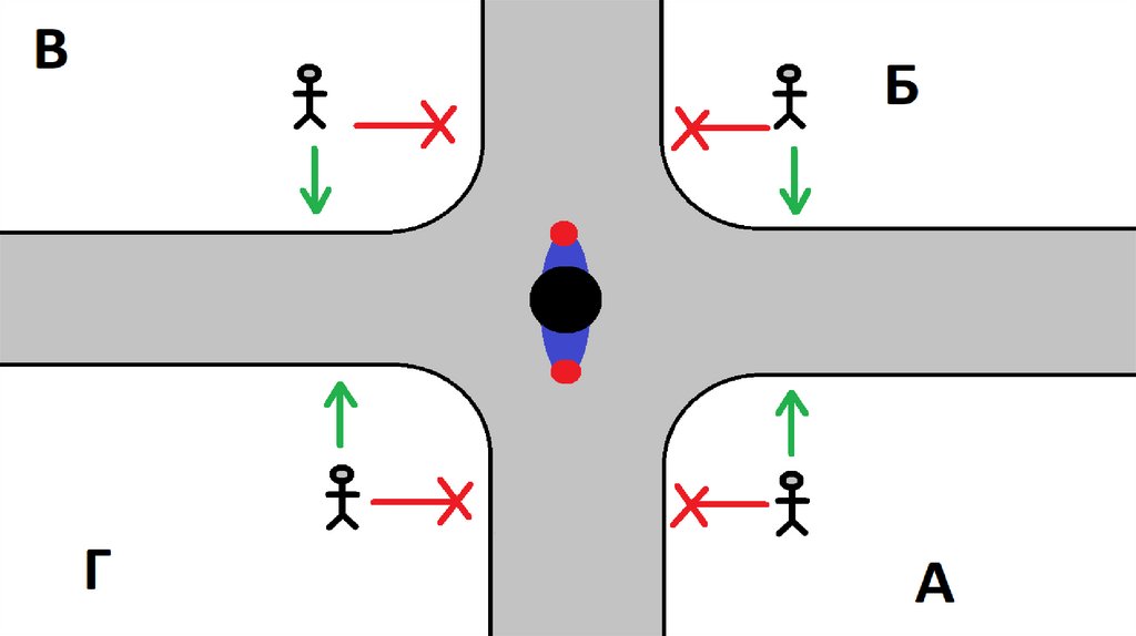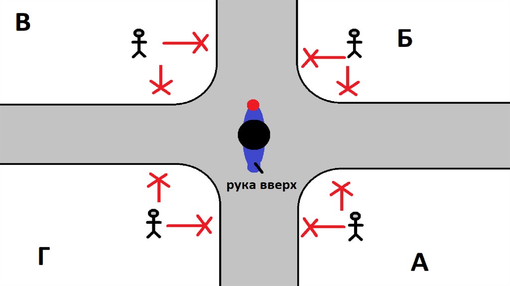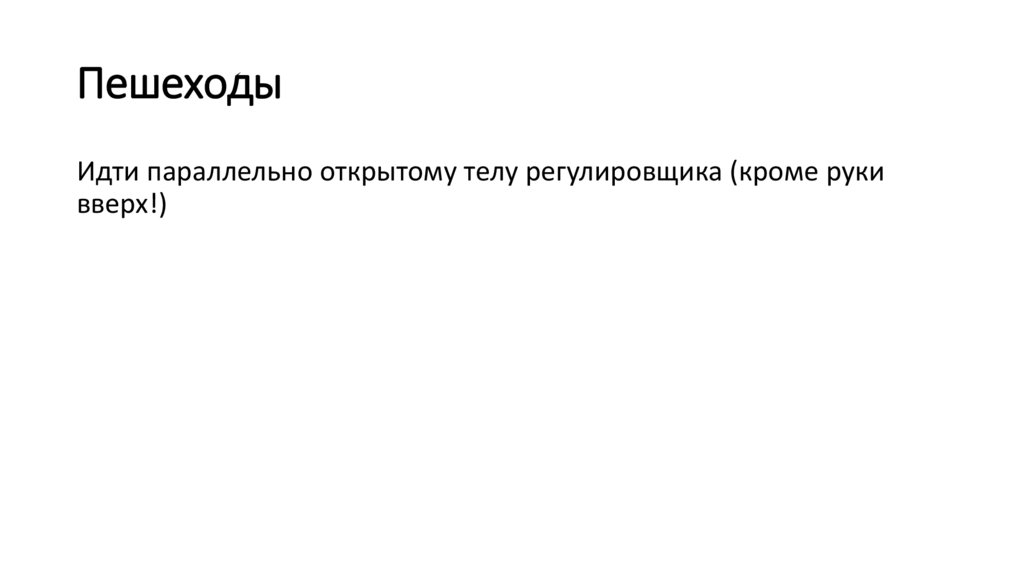 ПешеходыИдти параллельно открытому телу регулировщика (кроме руки