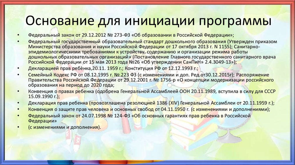 Основание для инициации программыФедеральный закон от 29.12.2012 № 273-ФЗ «Об образовании в Российской Федерации»;