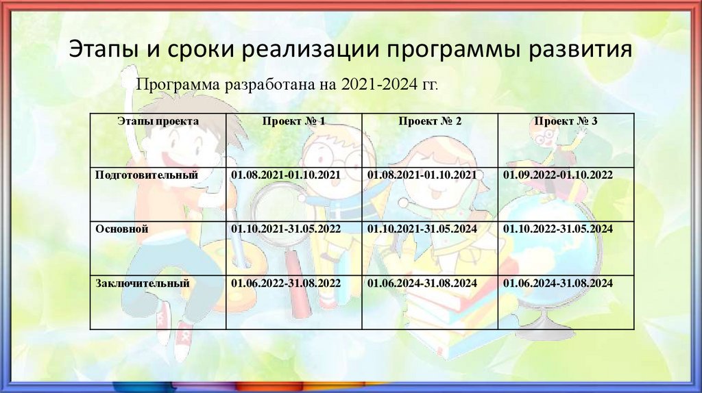 Этапы и сроки реализации программы развитияПрограмма разработана на 2021-2024 гг.