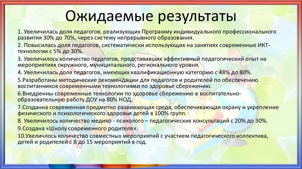 Ожидаемые результаты1. Увеличилась доля педагогов, реализующих Программу индивидуального профессионального