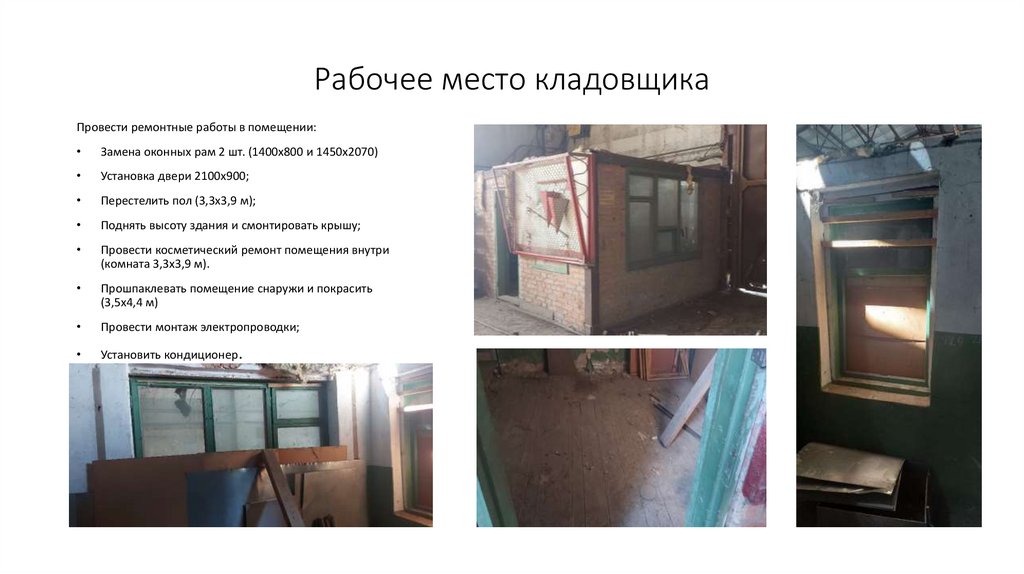 Рабочее место кладовщикаПровести ремонтные работы в помещении: