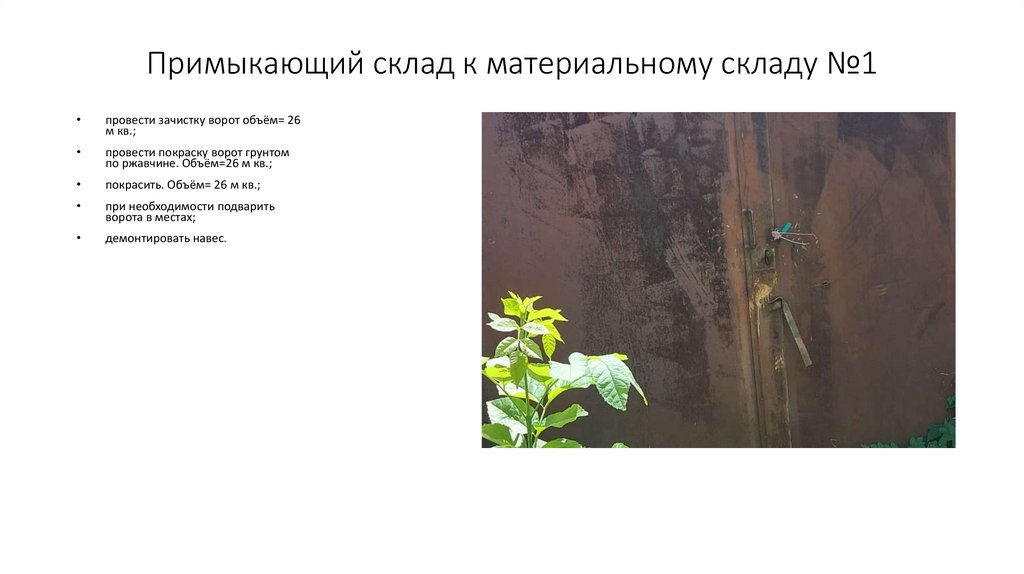 Примыкающий склад к материальному складу №1провести зачистку ворот объём= 26