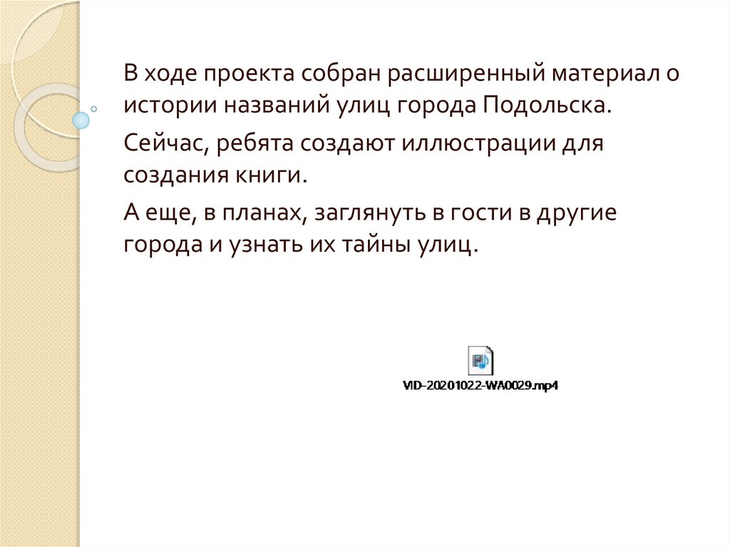 В ходе проекта собран расширенный материал оистории названий улиц города Подольска.