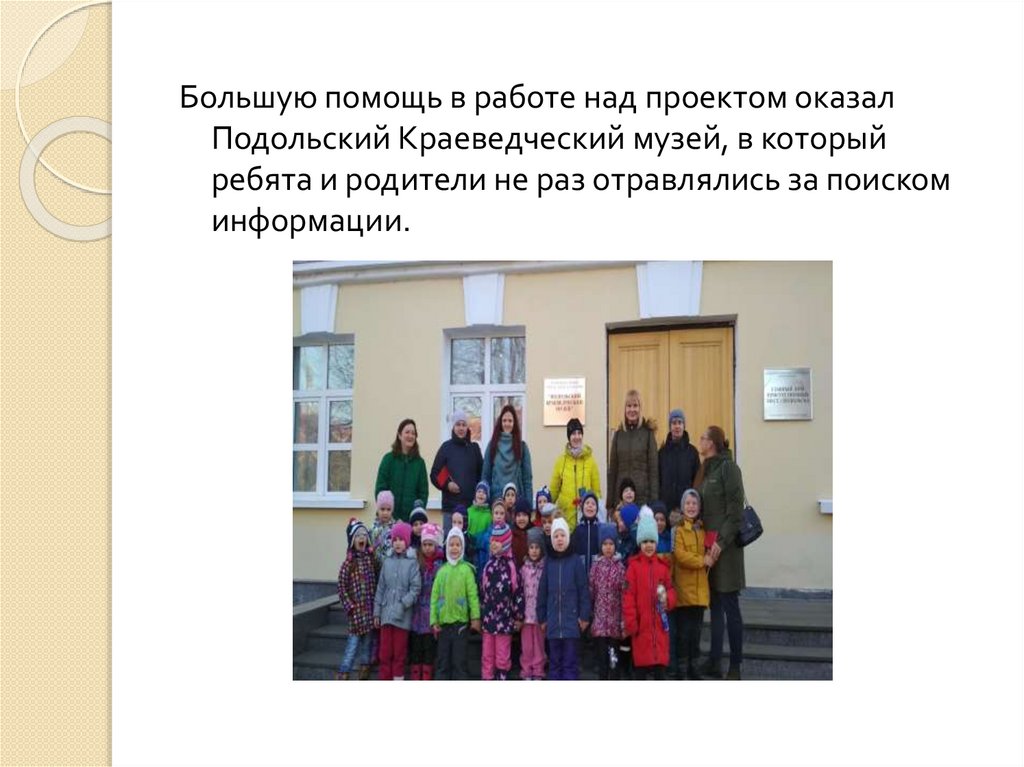 Большую помощь в работе над проектом оказалПодольский Краеведческий музей, в который