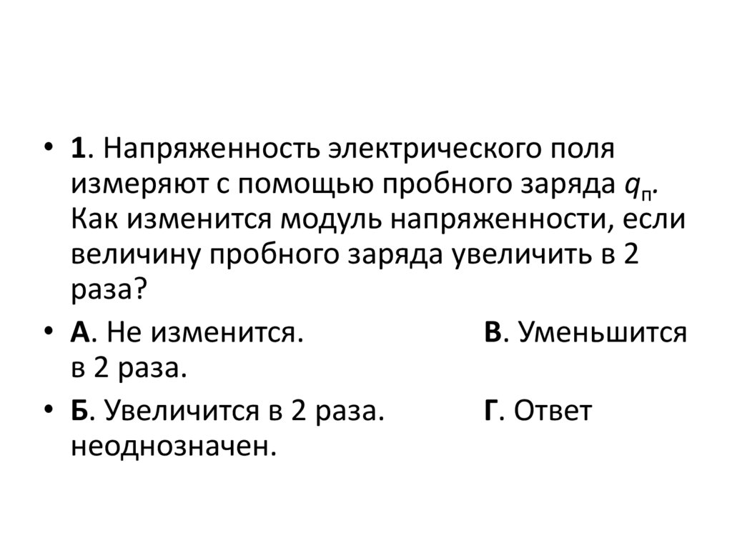 • 1. Напряженность электрического поляизмеряют с помощью пробного заряда qп.