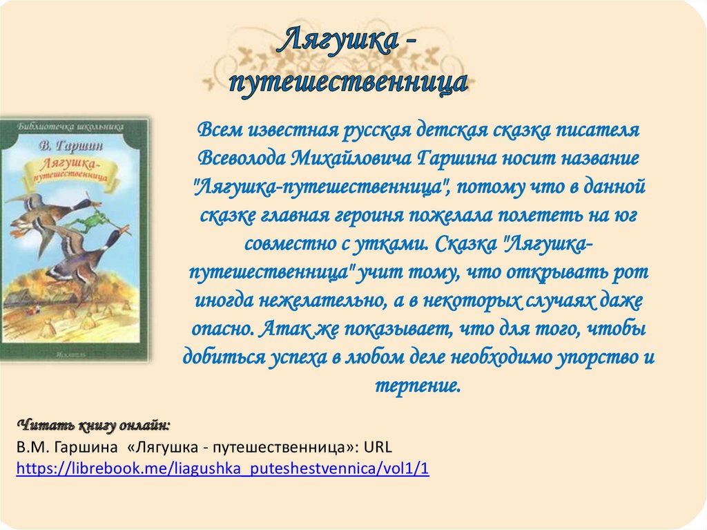Читать книгу онлайн:В.М. Гаршина «Лягушка - путешественница»: URL