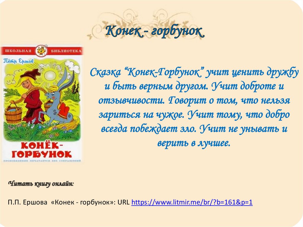 Читать книгу онлайн:П.П. Ершова «Конек - горбунок»: URL https://www.litmir.me/br/?b=161&p=1