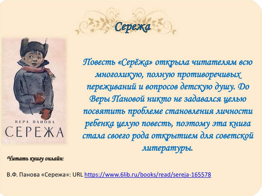 Читать книгу онлайн:В.Ф. Панова «Сережа»: URL https://www.6lib.ru/books/read/sereja-165578