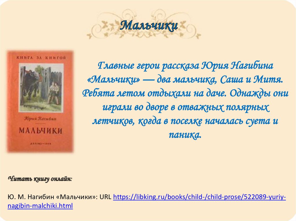 Читать книгу онлайн:Ю. М. Нагибин «Мальчики»: URL https://libking.ru/books/child-/child-prose/522089-yuriynagibin-malchiki.html