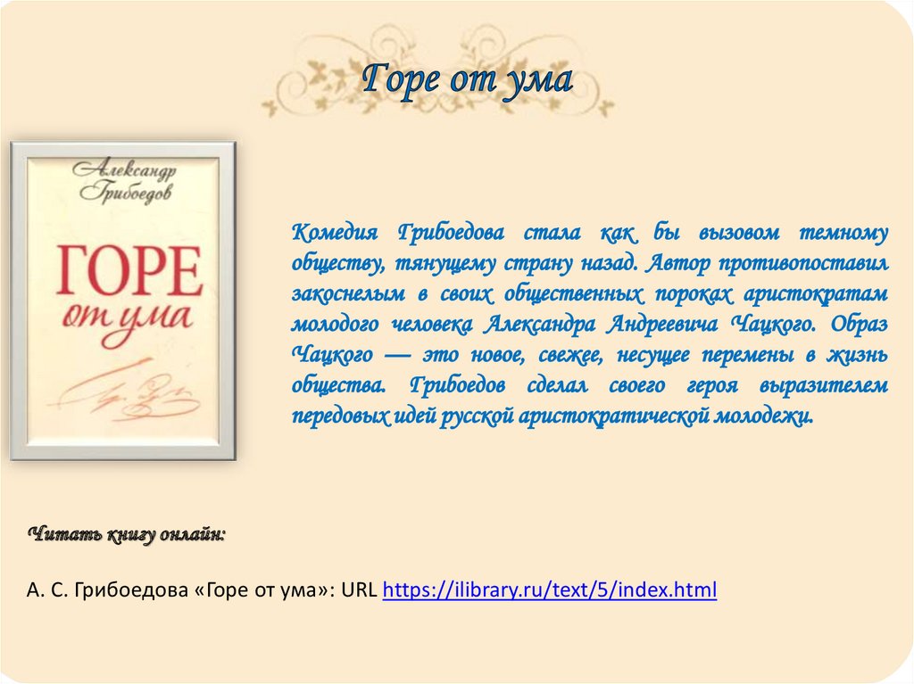 Читать книгу онлайн:А. С. Грибоедова «Горе от ума»: URL https://ilibrary.ru/text/5/index.html