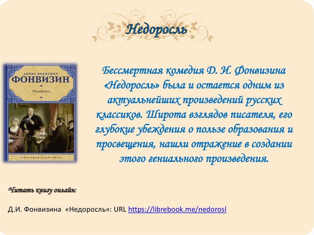 Читать книгу онлайн:Д.И. Фонвизина «Недоросль»: URL https://librebook.me/nedorosl