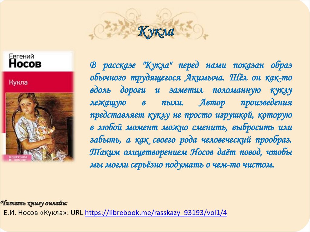 Читать книгу онлайн:Е.И. Носов «Кукла»: URL https://librebook.me/rasskazy_93193/vol1/4