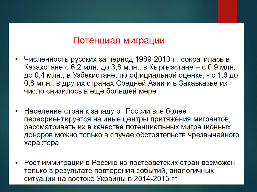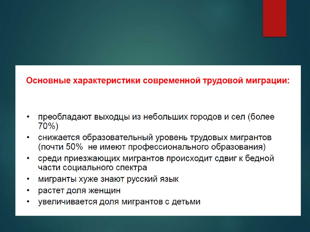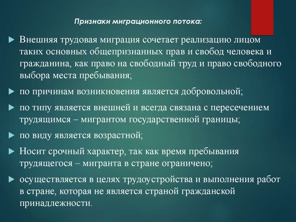 Признаки миграционного потока:Внешняя трудовая миграция сочетает реализацию лицом