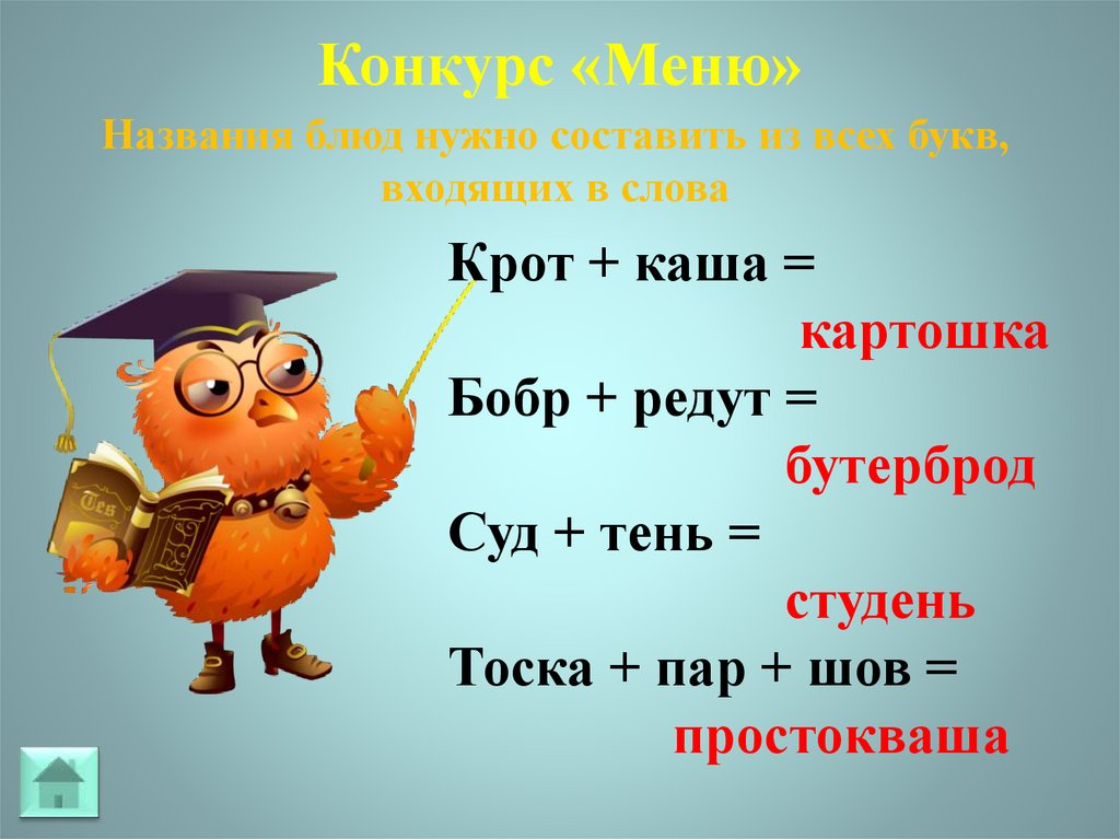 Конкурс «Меню»Названия блюд нужно составить из всех букв,