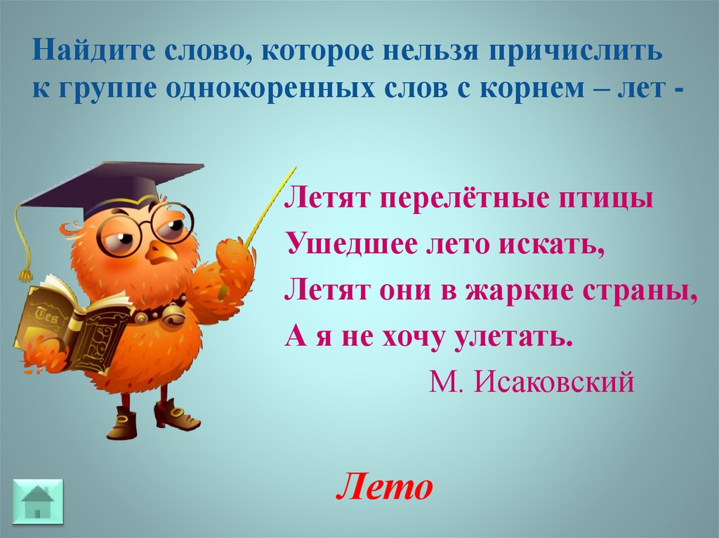 Найдите слово, которое нельзя причислитьк группе однокоренных слов с корнем – лет Летят перелётные птицы