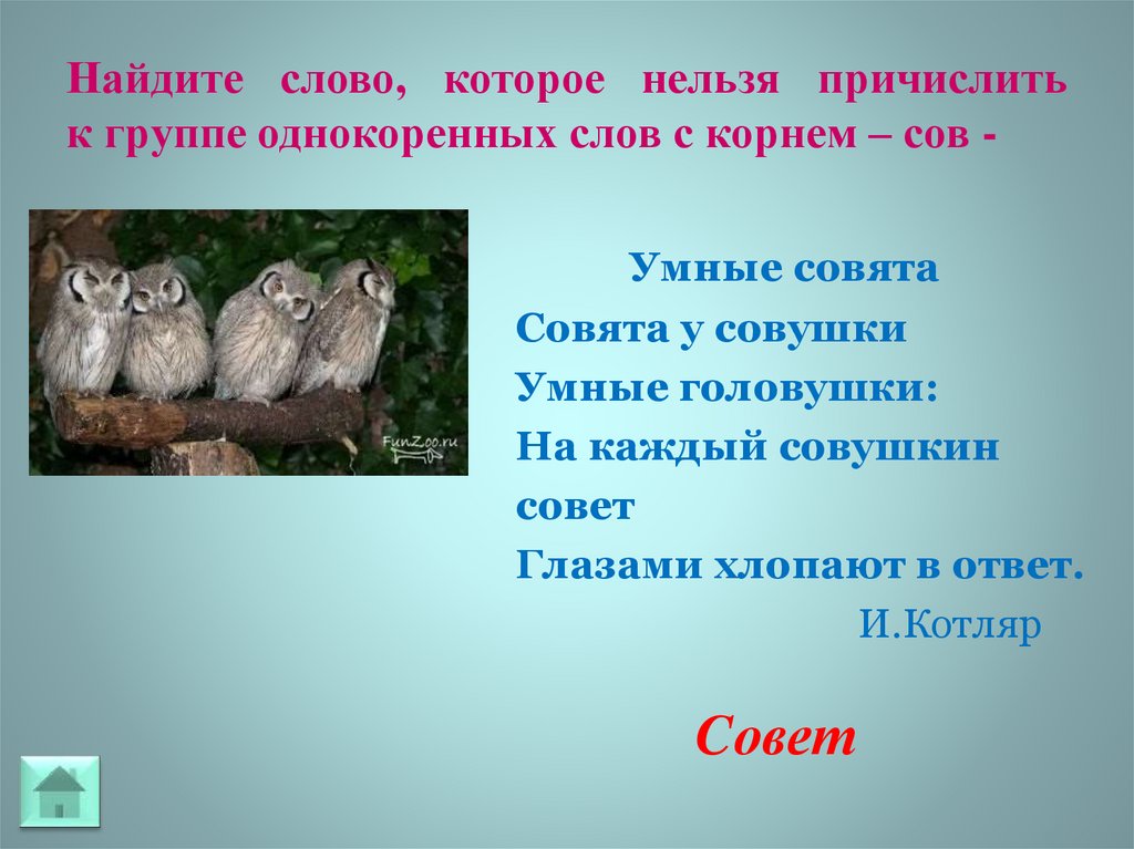 Найдите слово, которое нельзя причислитьк группе однокоренных слов с корнем – сов Умные совята