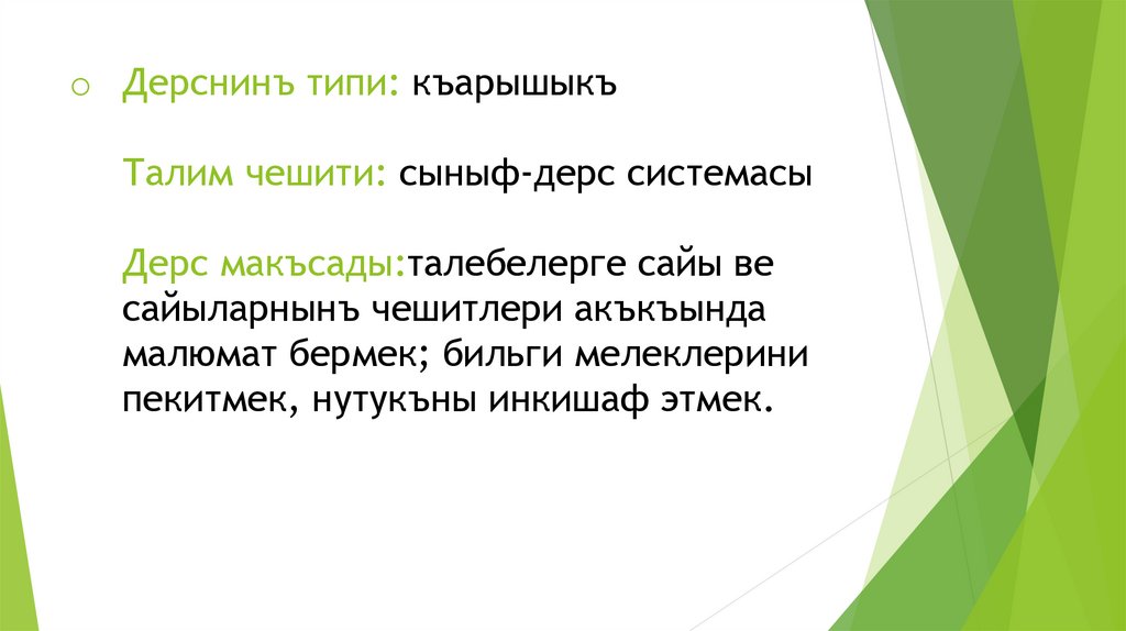 o Дерснинъ типи: къарышыкъТалим чешити: сыныф-дерс системасы