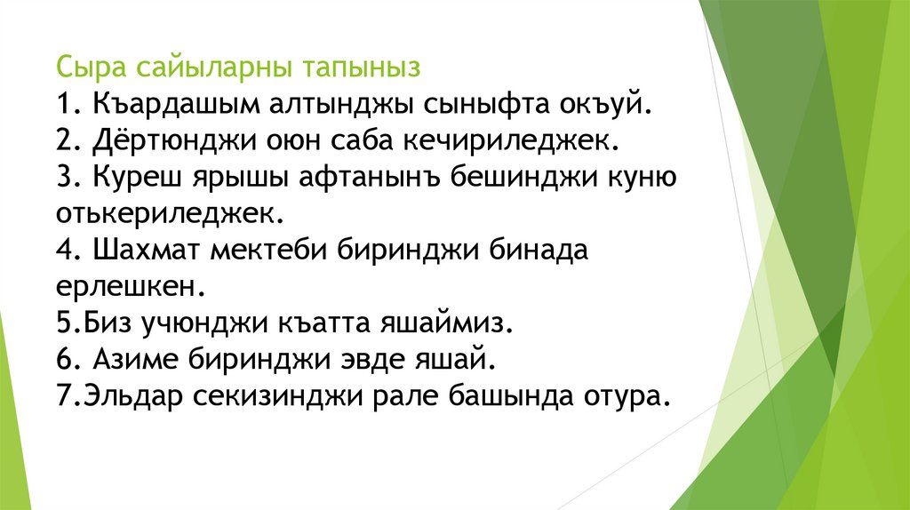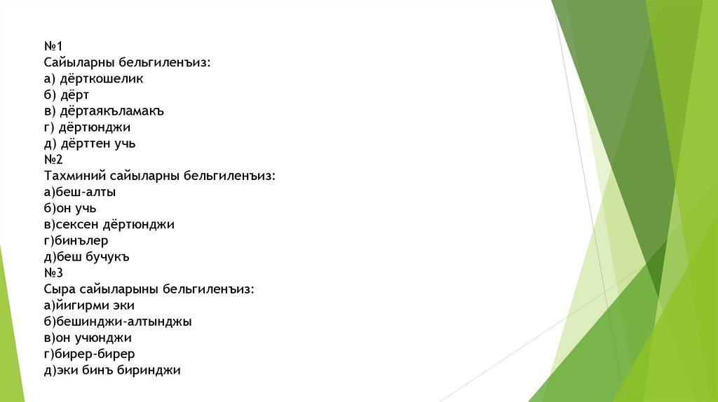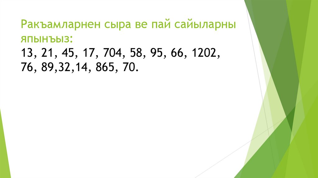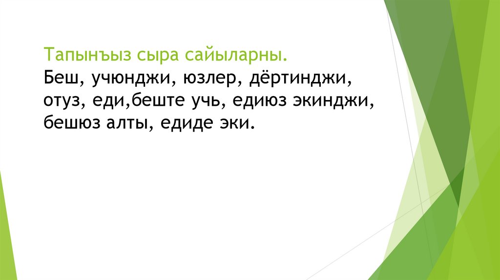 Тапынъыз сыра сайыларны.Беш, учюнджи, юзлер, дёртинджи,