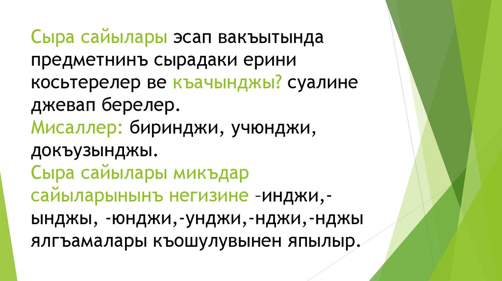 сайыларынынъ негизине –инджи,ынджы, -юнджи,-унджи,-нджи,-нджы