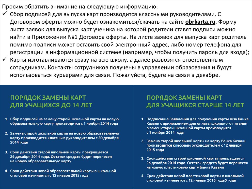 Просим обратить внимание на следующую информацию:Сбор подписей для выпуска карт производится классными руководителями. С