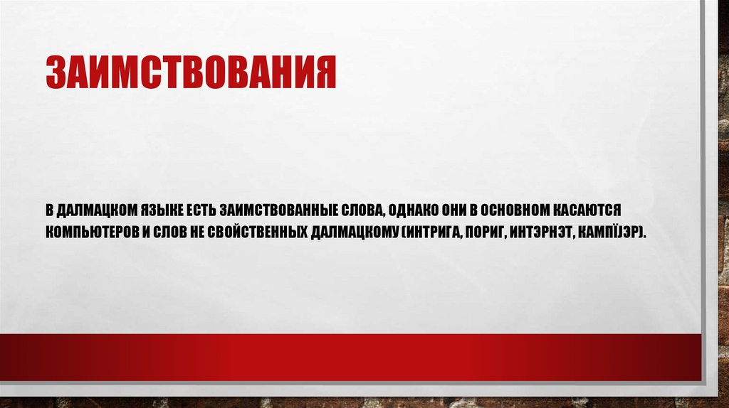 ЗАИМСТВОВАНИЯВ ДАЛМАЦКОМ ЯЗЫКЕ ЕСТЬ ЗАИМСТВОВАННЫЕ СЛОВА, ОДНАКО ОНИ В ОСНОВНОМ КАСАЮТСЯ