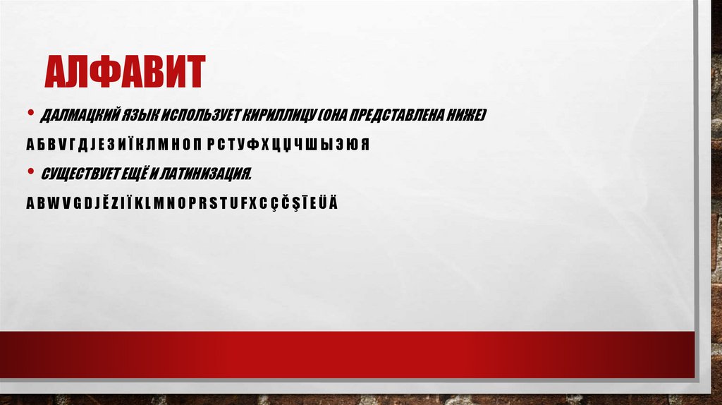 АЛФАВИТ• ДАЛМАЦКИЙ ЯЗЫК ИСПОЛЬЗУЕТ КИРИЛЛИЦУ (ОНА ПРЕДСТАВЛЕНА НИЖЕ)
