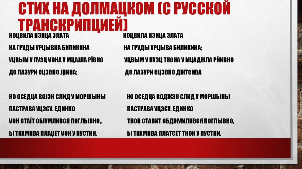 СТИХ НА ДОЛМАЦКОМ (С РУССКОЙТРАНСКРИПЦИЕЙ)