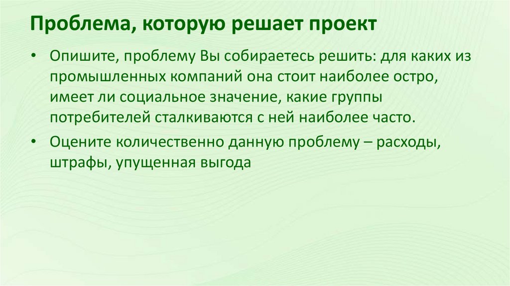 Проблема, которую решает проект• Опишите, проблему Вы собираетесь решить: для каких из