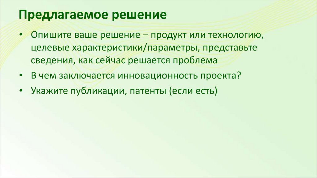 Предлагаемое решение• Опишите ваше решение – продукт или технологию,