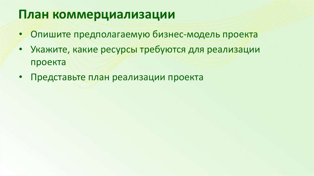 План коммерциализации• Опишите предполагаемую бизнес-модель проекта