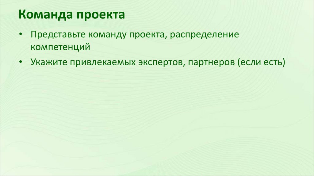 Команда проекта• Представьте команду проекта, распределение