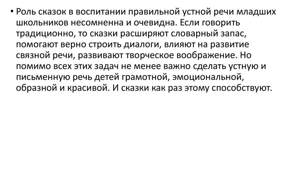 • Роль сказок в воспитании правильной устной речи младшихшкольников несомненна и очевидна. Если говорить