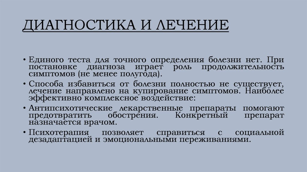 ДИАГНОСТИКА И ЛЕЧЕНИЕ• Единого теста для точного определения болезни нет. При