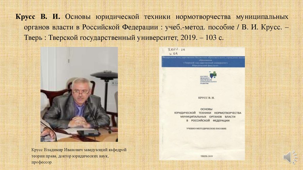 Крусс В. И. Основы юридической техники нормотворчества муниципальныхорганов власти в Российской Федерации : учеб.-метод. пособие / В. И. Крусс. –