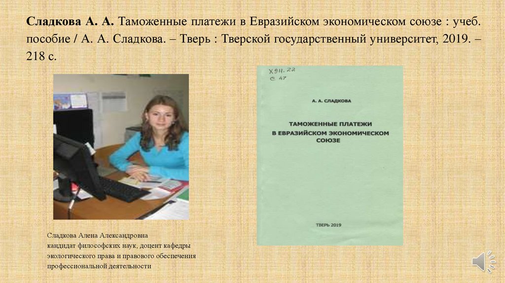 Сладкова А. А. Таможенные платежи в Евразийском экономическом союзе : учеб.пособие / А. А. Сладкова. – Тверь : Тверской государственный университет, 2019. –