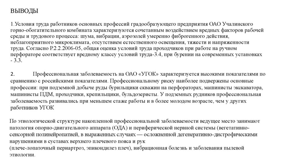 ВЫВОДЫ1.Условия труда работников основных профессий градообразующего предприятия ОАО Учалинского