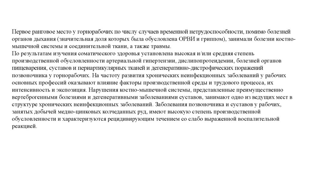 Первое ранговое место у горнорабочих по числу случаев временной нетрудоспособности, помимо болезнейорганов дыхания (значительная доля которых была обусловлена ОРВИ и гриппом), занимали болезни костномышечной системы и соединительной ткани, а также травмы.