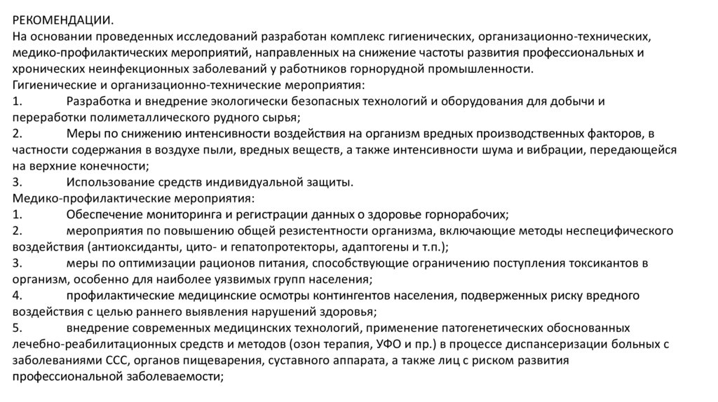 РЕКОМЕНДАЦИИ.На основании проведенных исследований разработан комплекс гигиенических, организационно-технических,