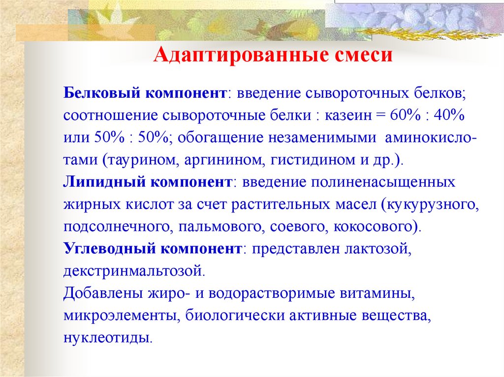 Адаптированные смесиБелковый компонент: введение сывороточных белков;