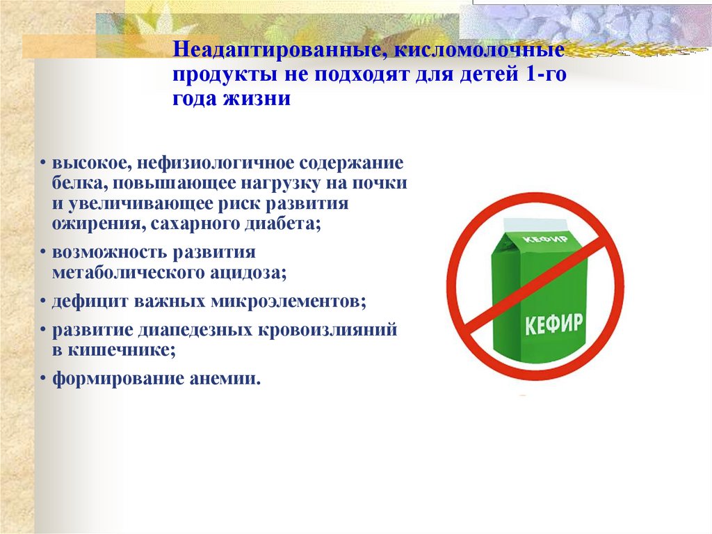 Неадаптированные, кисломолочныепродукты не подходят для детей 1-го