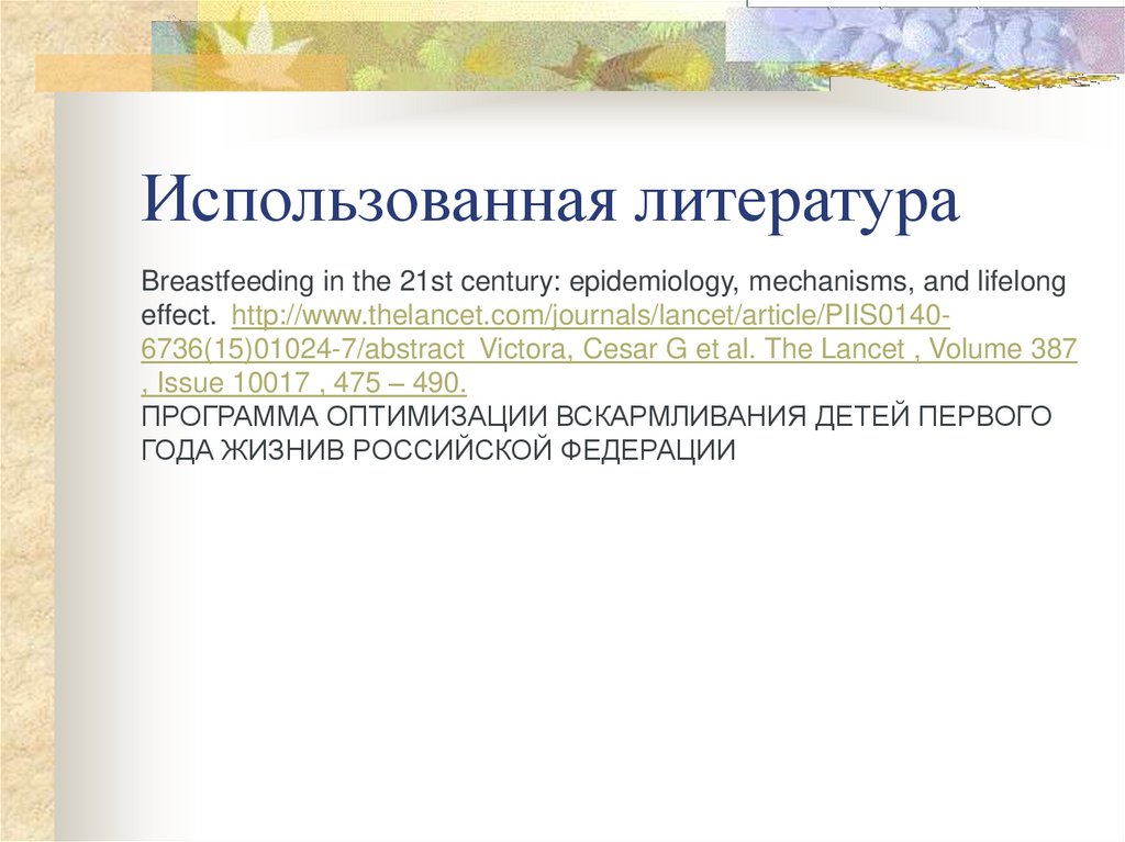Использованная литератураBreastfeeding in the 21st century: epidemiology, mechanisms, and lifelong