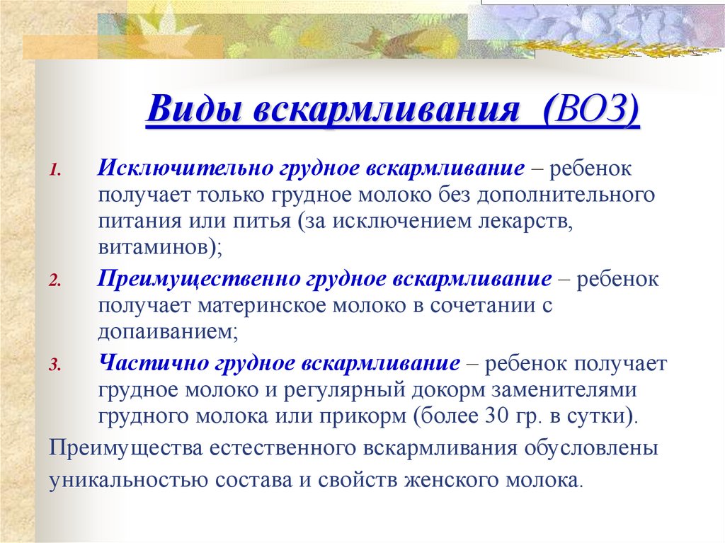Виды вскармливания (ВОЗ)Исключительно грудное вскармливание – ребенок