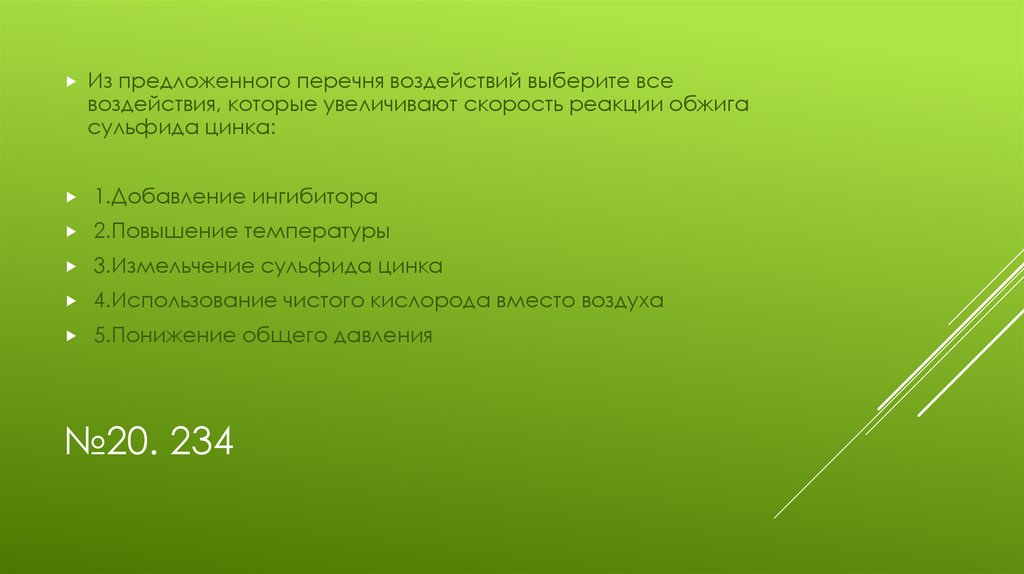 Из предложенного перечня воздействий выберите всевоздействия, которые увеличивают скорость реакции обжига