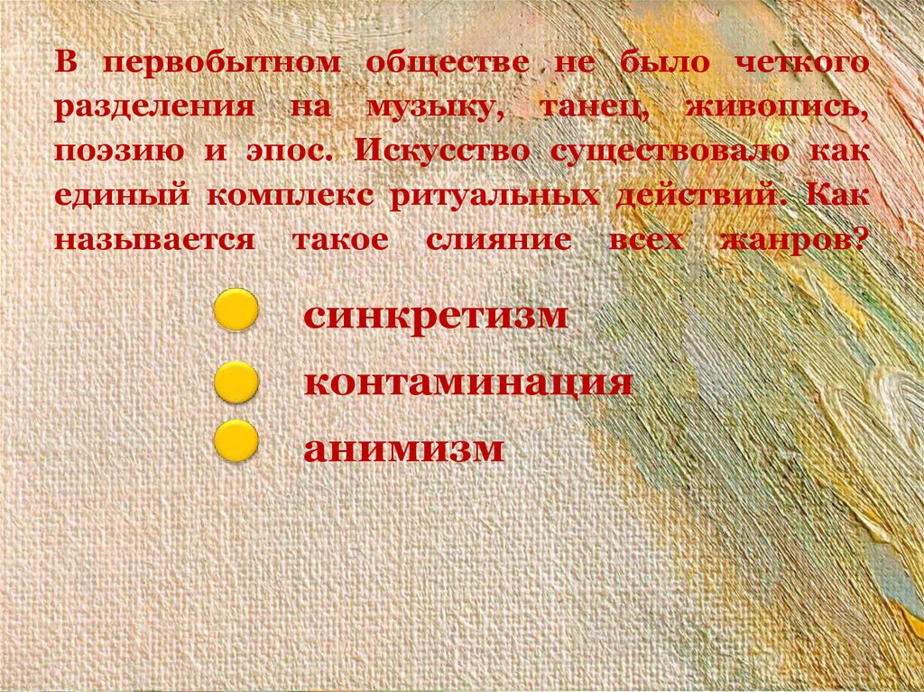 В первобытном обществе не было четкогоразделения на музыку, танец, живопись,