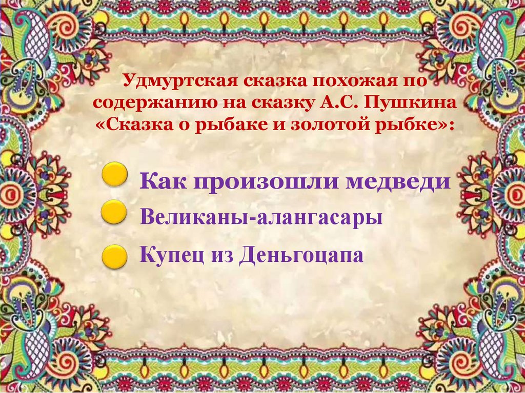 Удмуртская сказка похожая посодержанию на сказку А.С. Пушкина