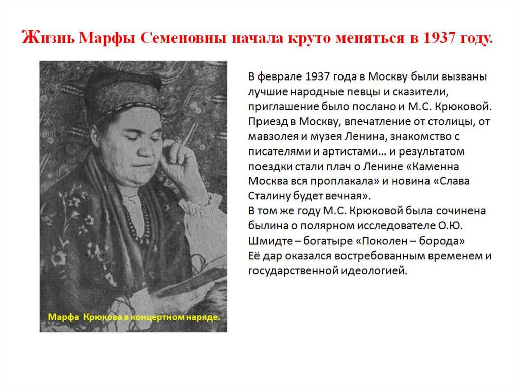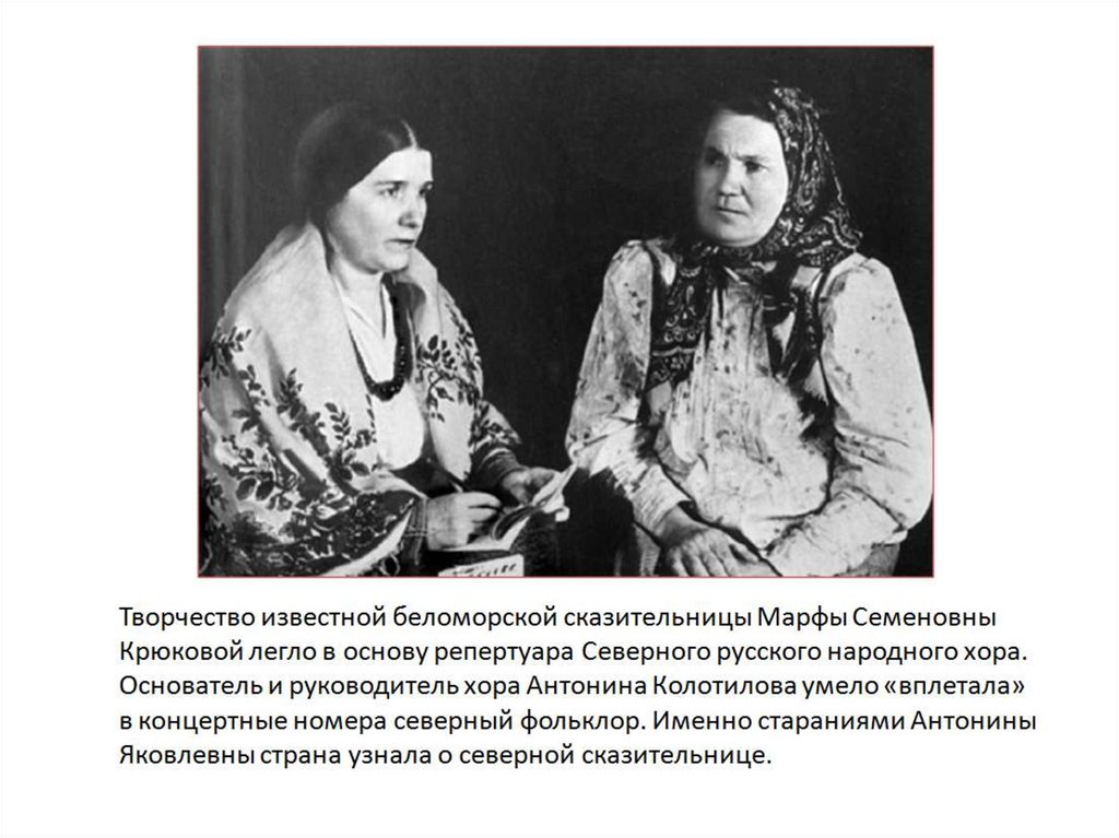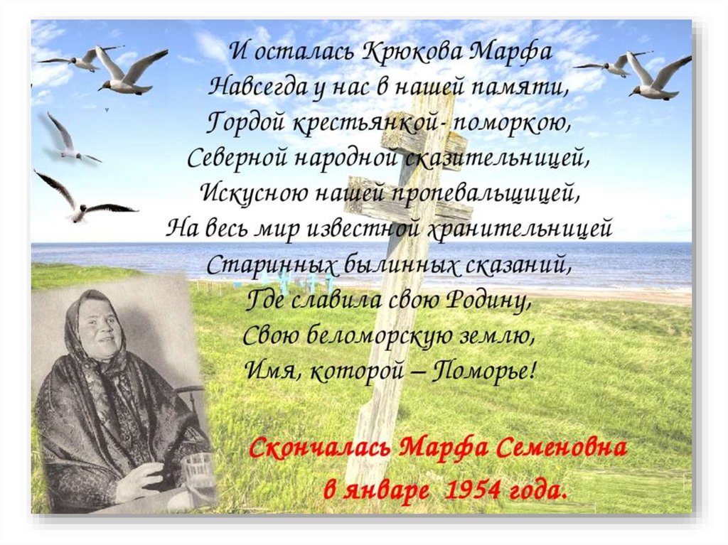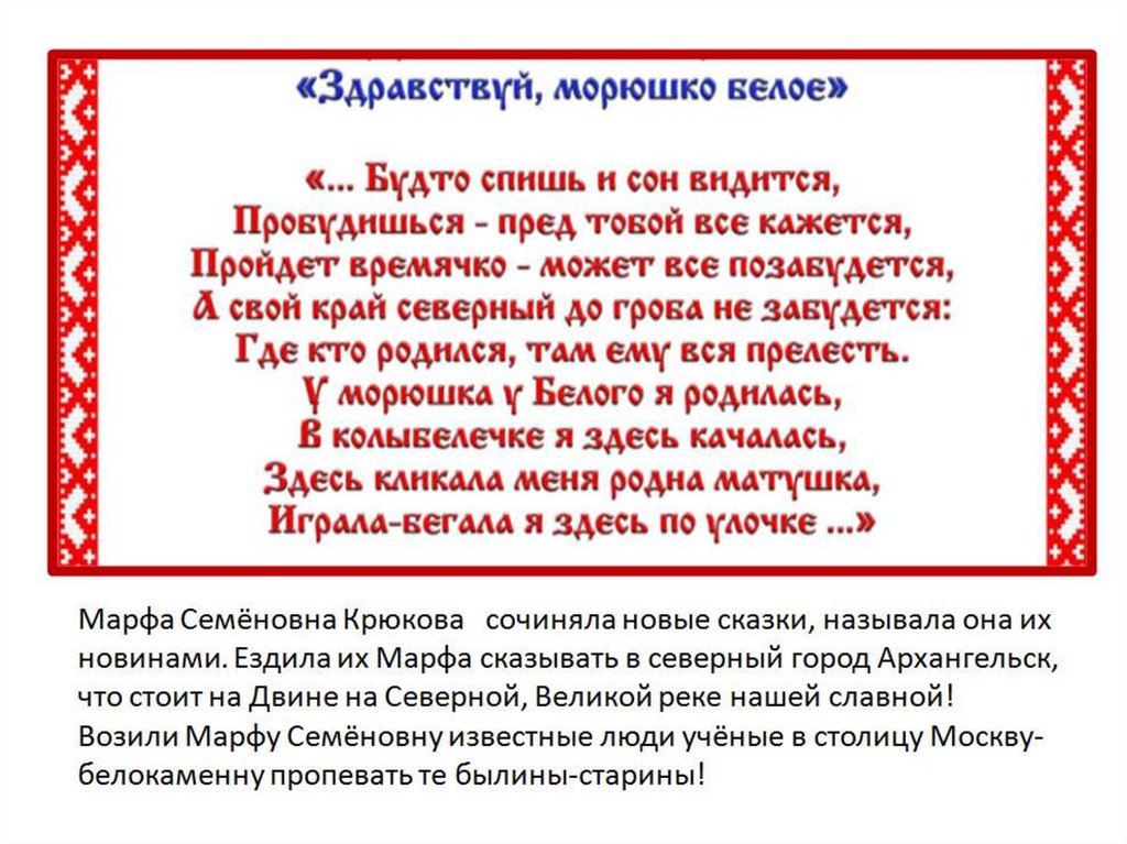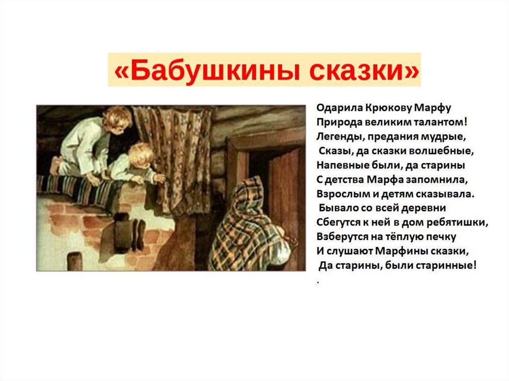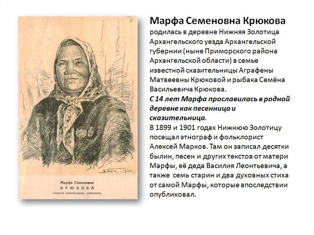 Все земляки Марфы Крюковой уважали её да гордилисьеё искусным умением рассказывать сказки чудные,