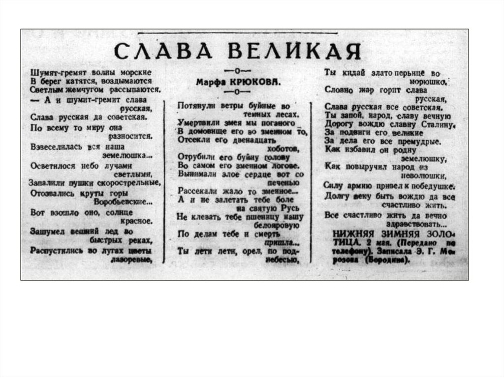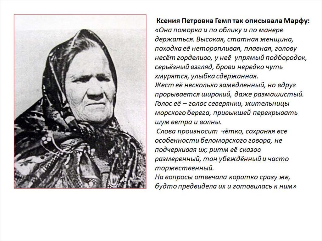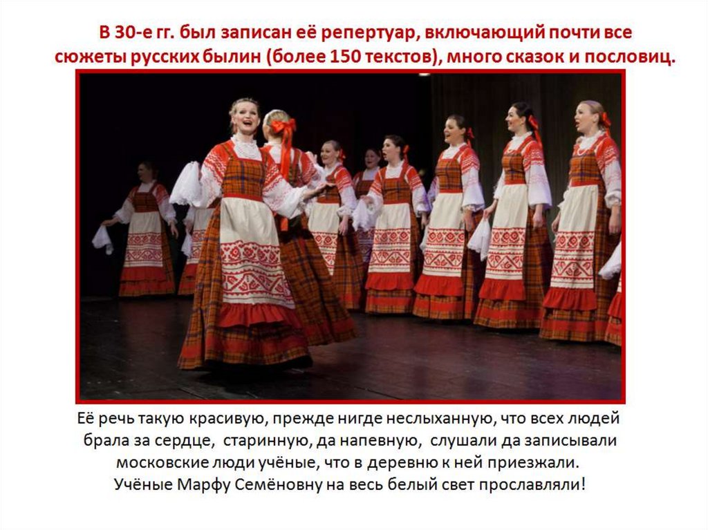 Марфа Семеновна обладала феноменальной памятью.Она помнила три тысячи страниц былинного текста!».