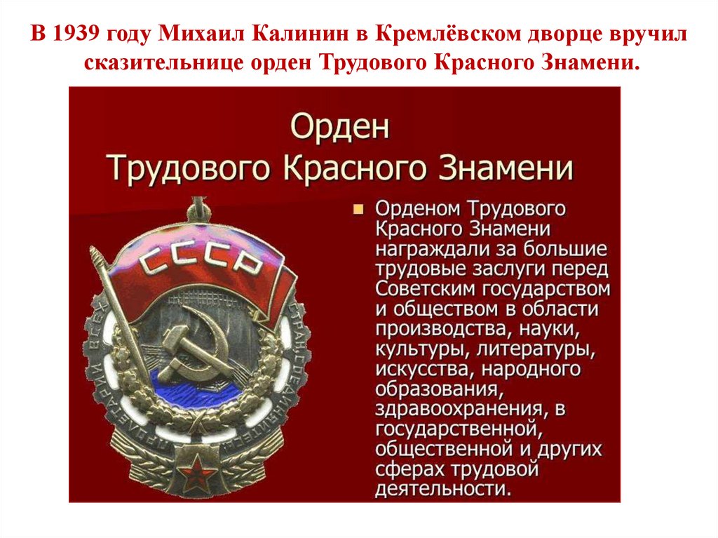 В 1939 году Михаил Калинин в Кремлёвском дворце вручилсказительнице орден Трудового Красного Знамени.