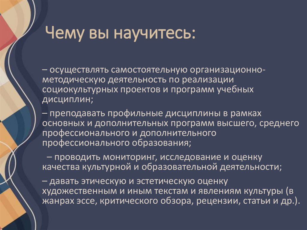 Чему вы научитесь:– осуществлять самостоятельную организационнометодическую деятельность по реализации