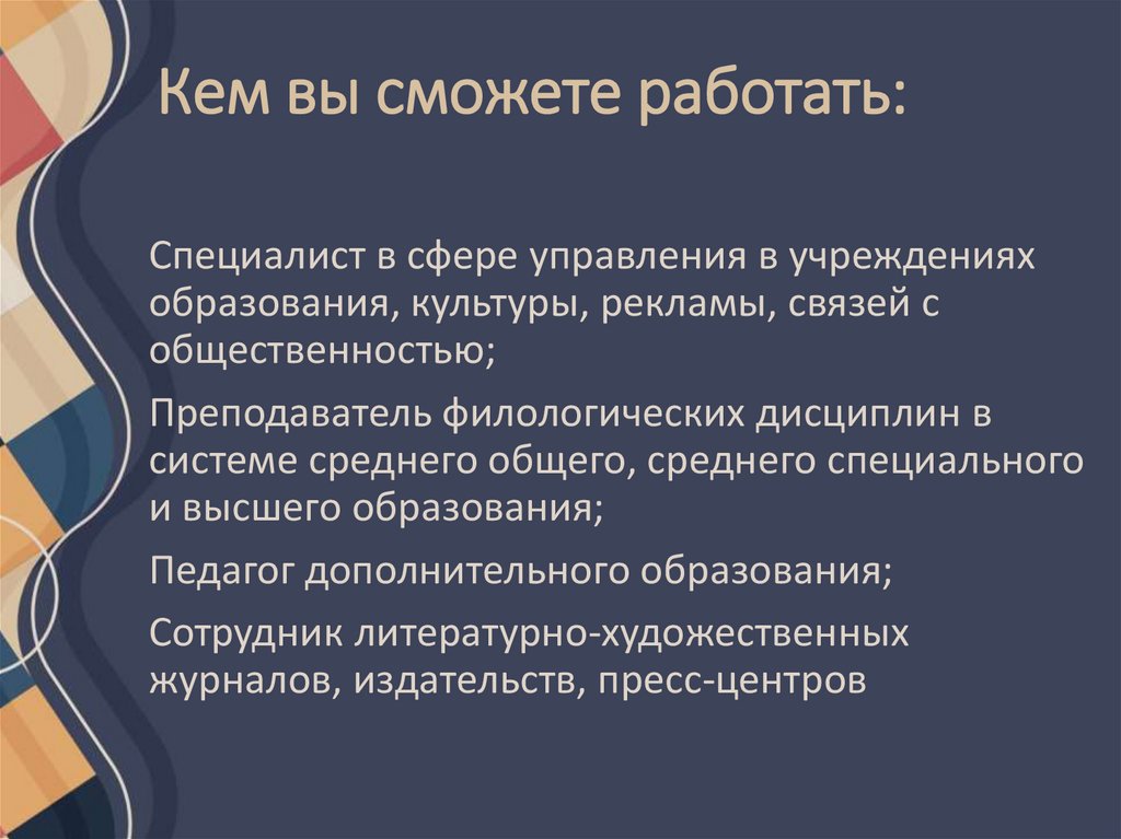 Кем вы сможете работать:Специалист в сфере управления в учреждениях